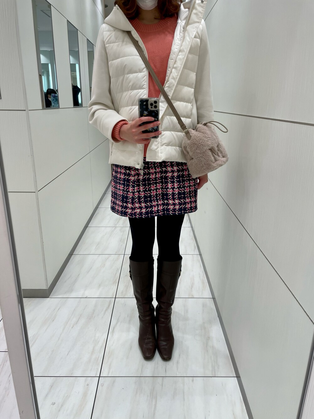 休日のお出掛けコーディネート❣️ BURBERRYのサーモンピンクのニットに、PRADAのスカートを合わせました☺️💕 冬は台形スカートとブーツの組合せがお気に入りです🙋♀️♥️