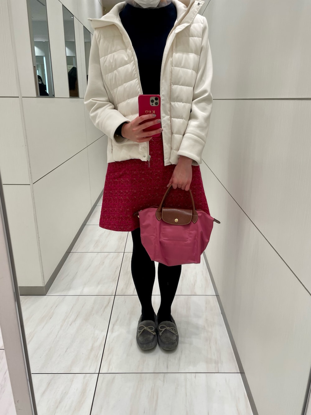 休日のお出掛けコーディネート💘 JILLSTUARTのニットに、Aveniretoileのツイードスカートを合わせました🧸💕 キレイめな格好なので、ダウンジャケットでカジュアルダウンしてみました😎👍🏻✨