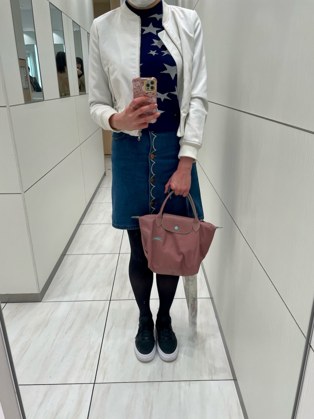 休日のコーディネート💘 LOEWEの星柄ニットに、See By Chloeのデニムスカートを合わせました🧸💕 結構気温高いのに雨風のせいで寒くてタイツ復活😭☔️