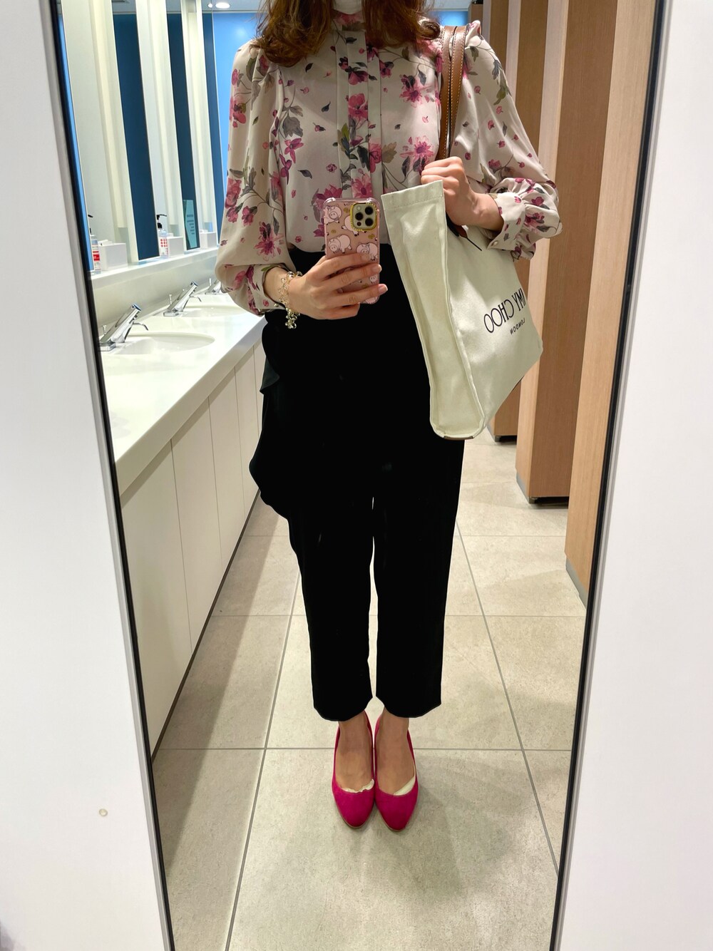 ある日の通勤コーディネート★ JILLSTUARTの花柄ブラウスに、CELFORDのフリルパンツを合わせました🐰💓 上下共にボリューム感ある感じになってしまった‥🥹😂
