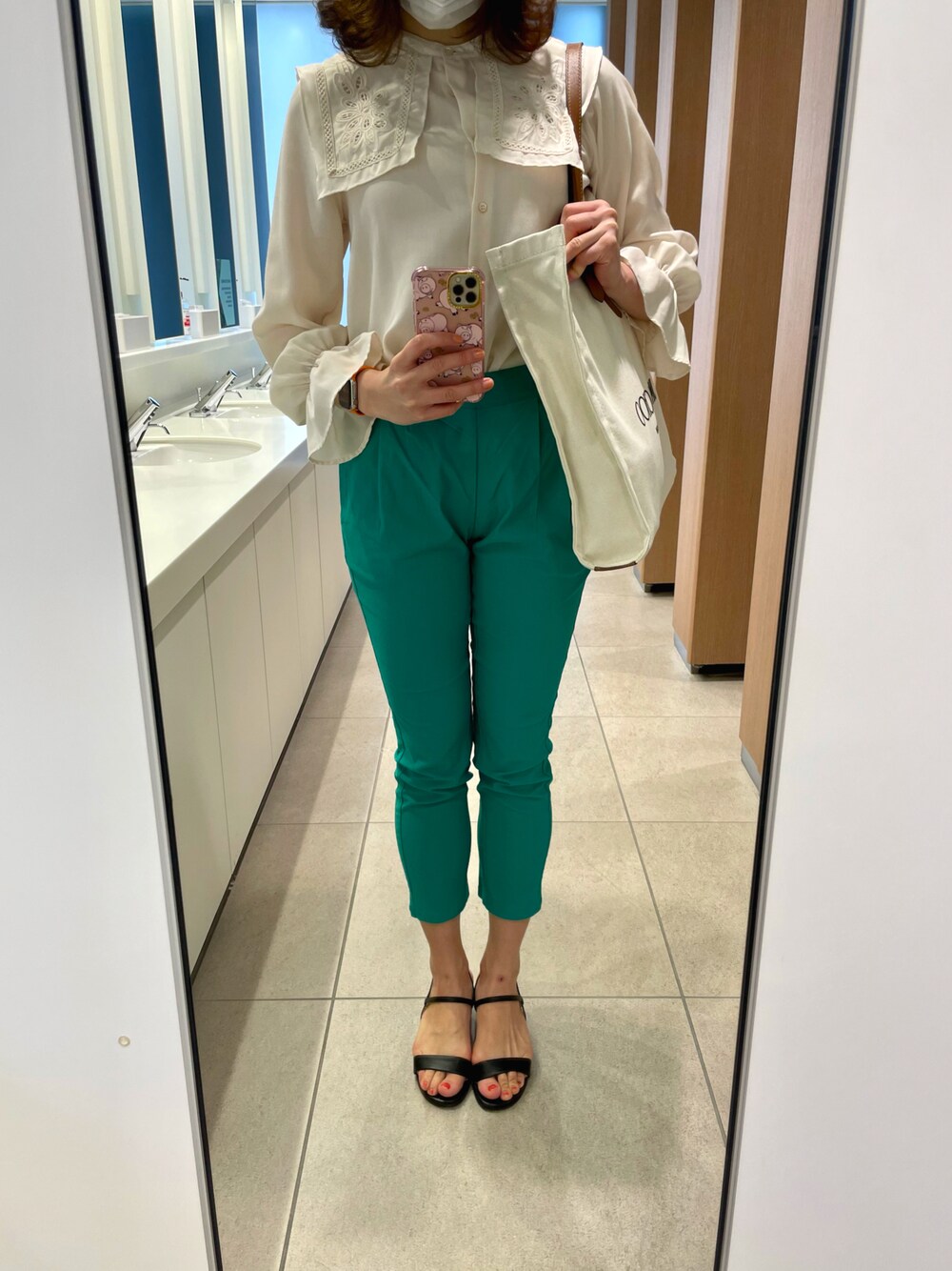 ある日の通勤コーディネート♥︎ Jill by JILLSTUARTのビッグカラーブラウスに、Bou Jeloudの緑のパンツを合わせました😆💕 トレンドの緑に初挑戦してみました😌✨