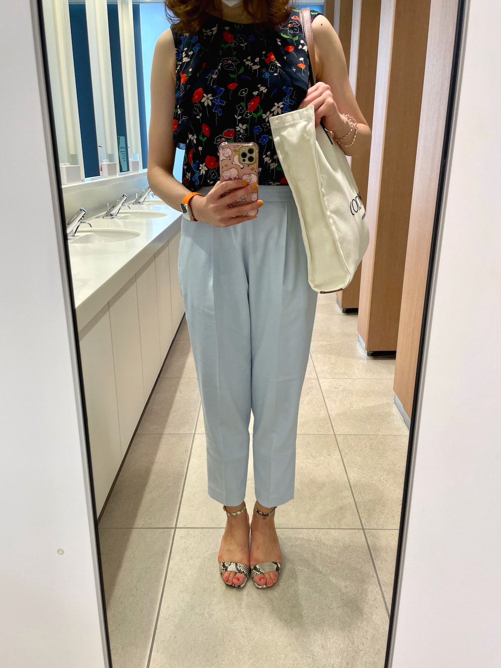 ある日の通勤コーディネート♡ JILLSTUARTの花柄ブラウスに、ELENDEEKのパンツを合わせました🥳💕 猛暑日なので、爽やかにブルーコーデです☺️💙