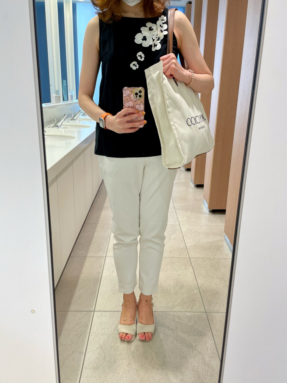 ある日の通勤コーディネート☆ Aveniretoileのお花ブラウスに、CELFORDの白パンツを合わせました☺️♥️ シンプルなモノトーンコーデに、お花モチーフで甘さをプラスしてみました😚🌼