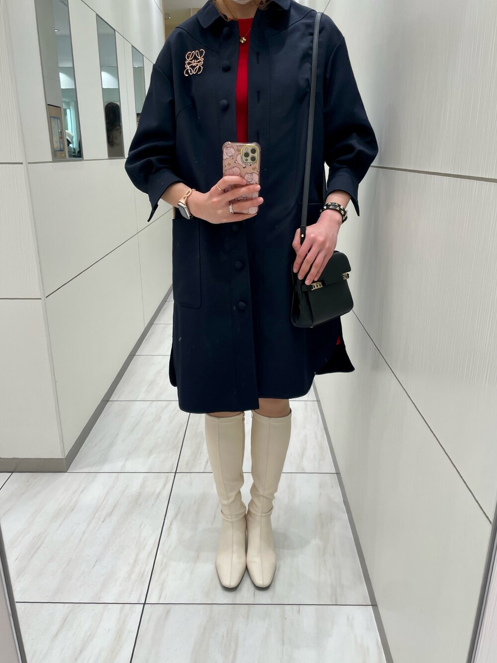 休日のお出掛けコーディネート❤️🩹 SNIDELの赤いニットワンピースに、Reneのアウターを合わせました😊❤️ ロングブーツは白じゃなくて黒にすれば良かったかな‥🥹🤔