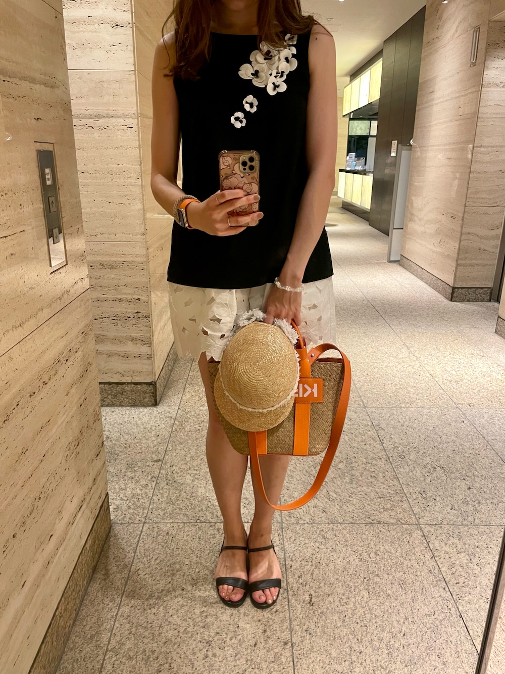 休日のお出掛けコーディネート❤️🩹 Aveniretoileのお花ブラウスに、RED VALENTINOのレースショートパンツを合わせました👯♀️💕 昨日に引き続きモノトーンで、オレンジのかごバッグを差し色にしました☺️🍊🧡