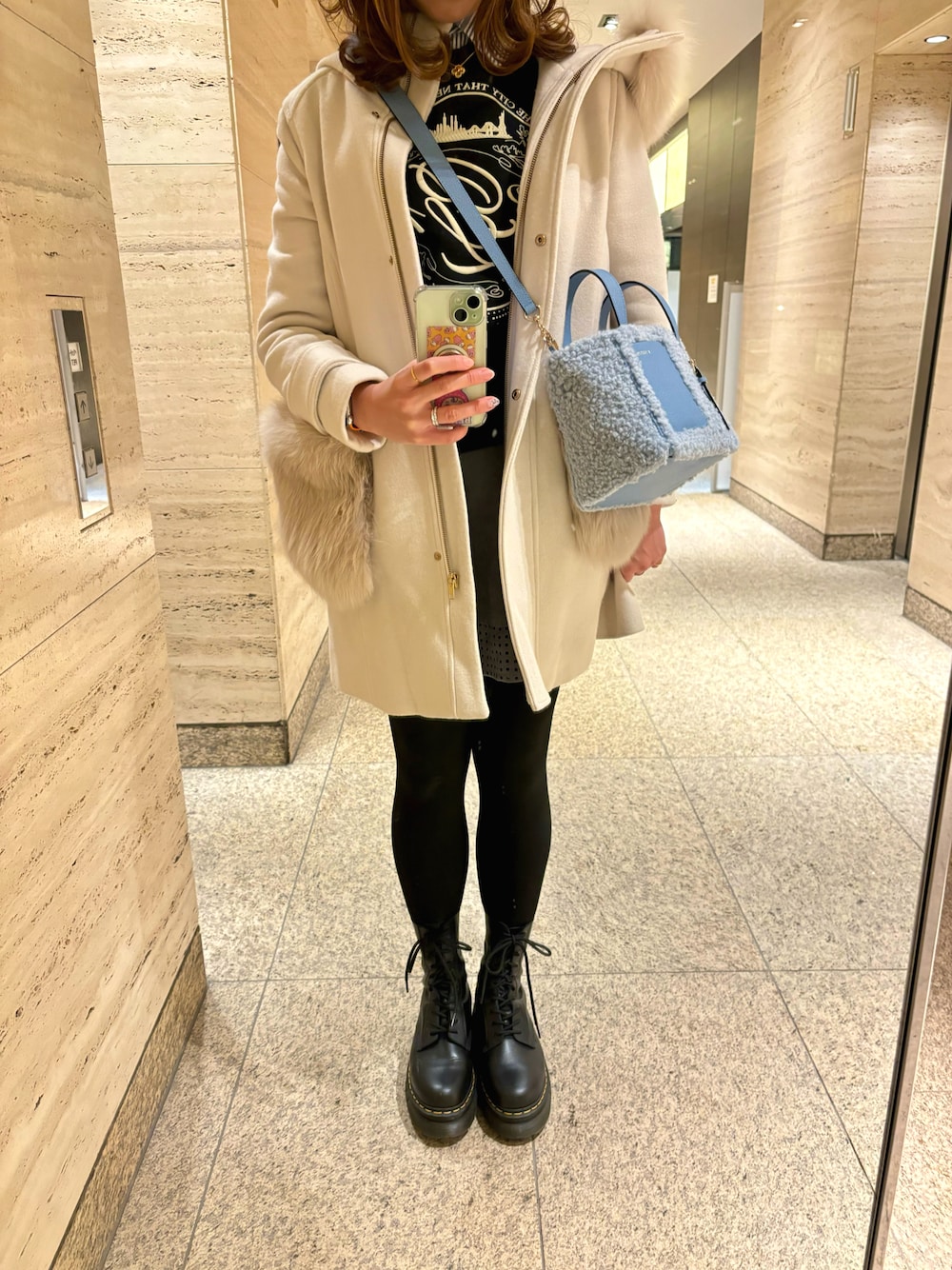 休日のお出掛けコーディネート🧡 3.1 Phillip Limのスウェットに、JILLSTUARTのスカートを合わせました😆💕 新調したValextraのもこもこのファーバッグがお気に入り🥺🩵