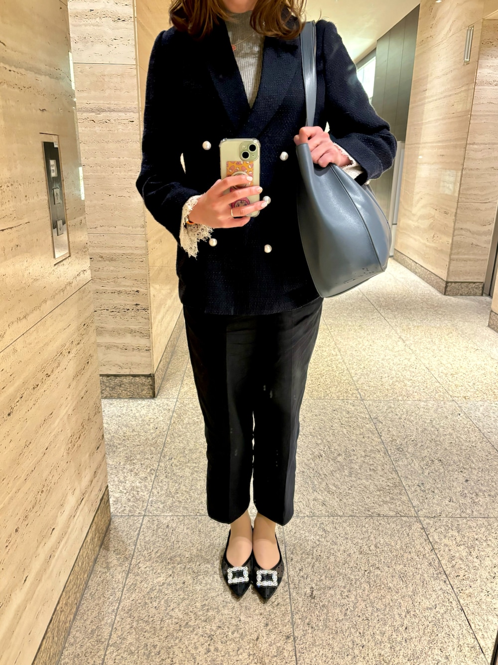 ある日の通勤コーディネート♡⃛ Aveniretoileのリブニットに、UNITED ARROWSのパンツを合わせて、JUSGLITTYのツイードジャケットを羽織りました😆💕 ニットはレース袖になっていて、ジャケットから出る感じがお気に入り🤩✨