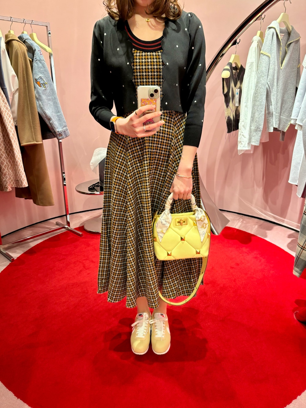 休日のお出掛けコーディネート❣️ MARNIのチェックワンピースに、U by SPICK&SPANのドットカーディガンを羽織りました🐣💛 暖かくてコート要らずな一日でした😊🌸