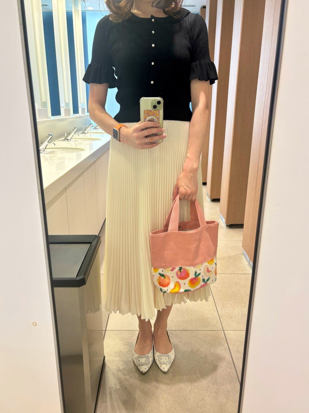 Aveniretoileのフリル袖カーディガンに、Reneのプリーツスカートを合わせました😆❤️ プリーツスカート涼しくてお気に入り〜🎐🤍