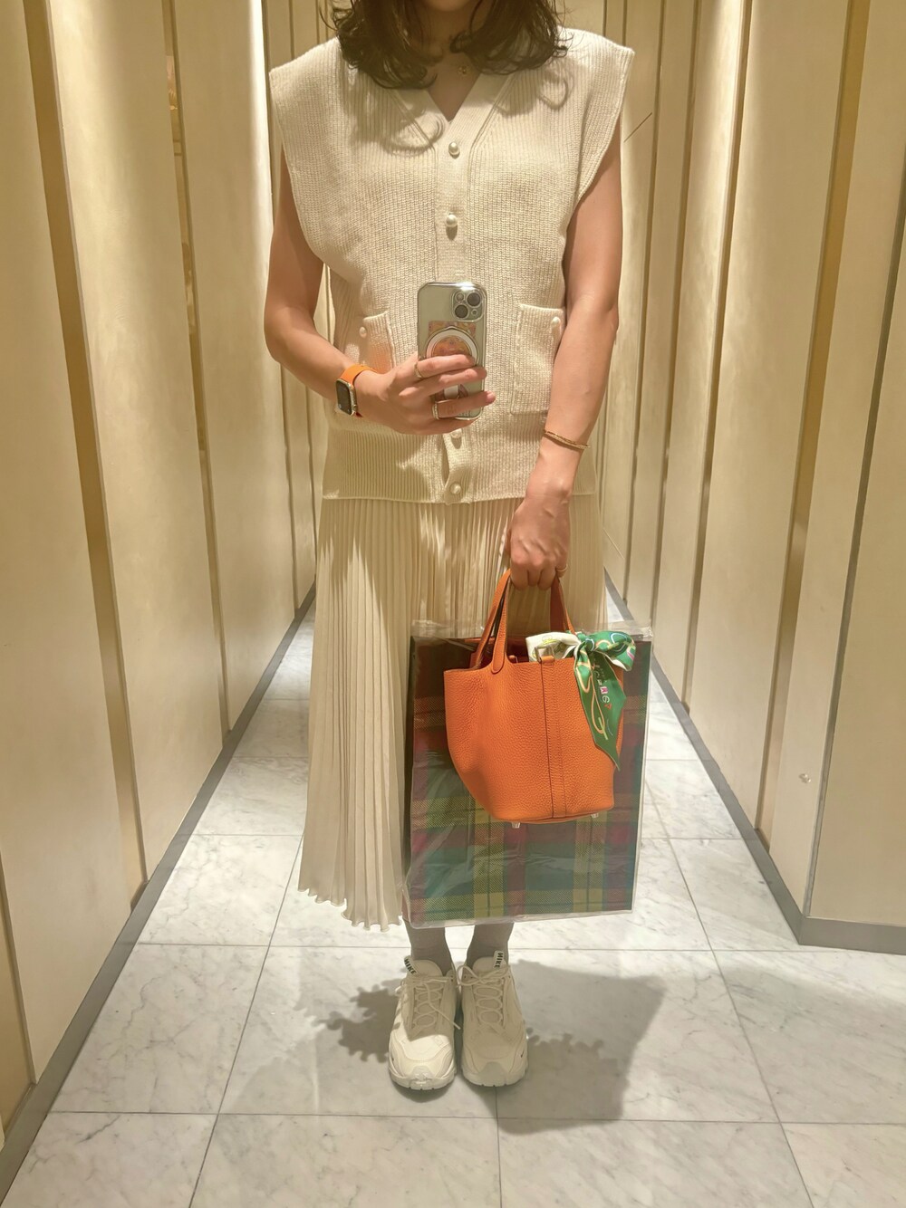 Reneのニットベストに、プリーツワンピースを合わせました👼🏻💓 全身ホワイトに、オレンジを差し色にしました🍊🧡