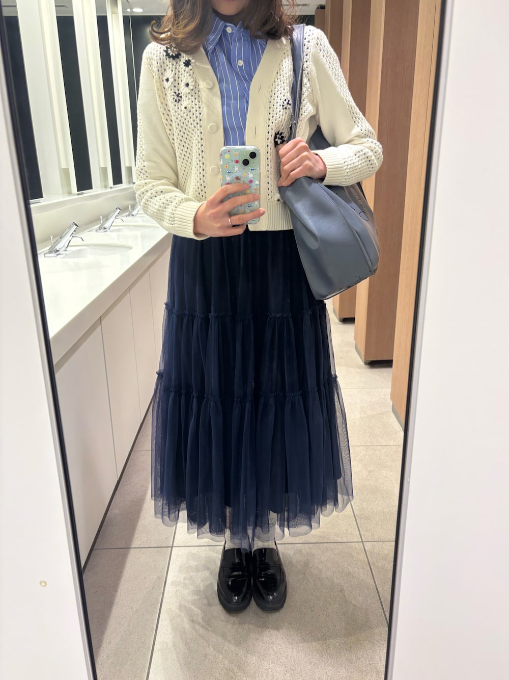 GENERAL IDEAのストライプシャツに、CADUNEのチュールスカートを合わせました👼🏻💓 同じくらいの短め丈のReneのカーディガンを羽織りにしました😚🫰🏻