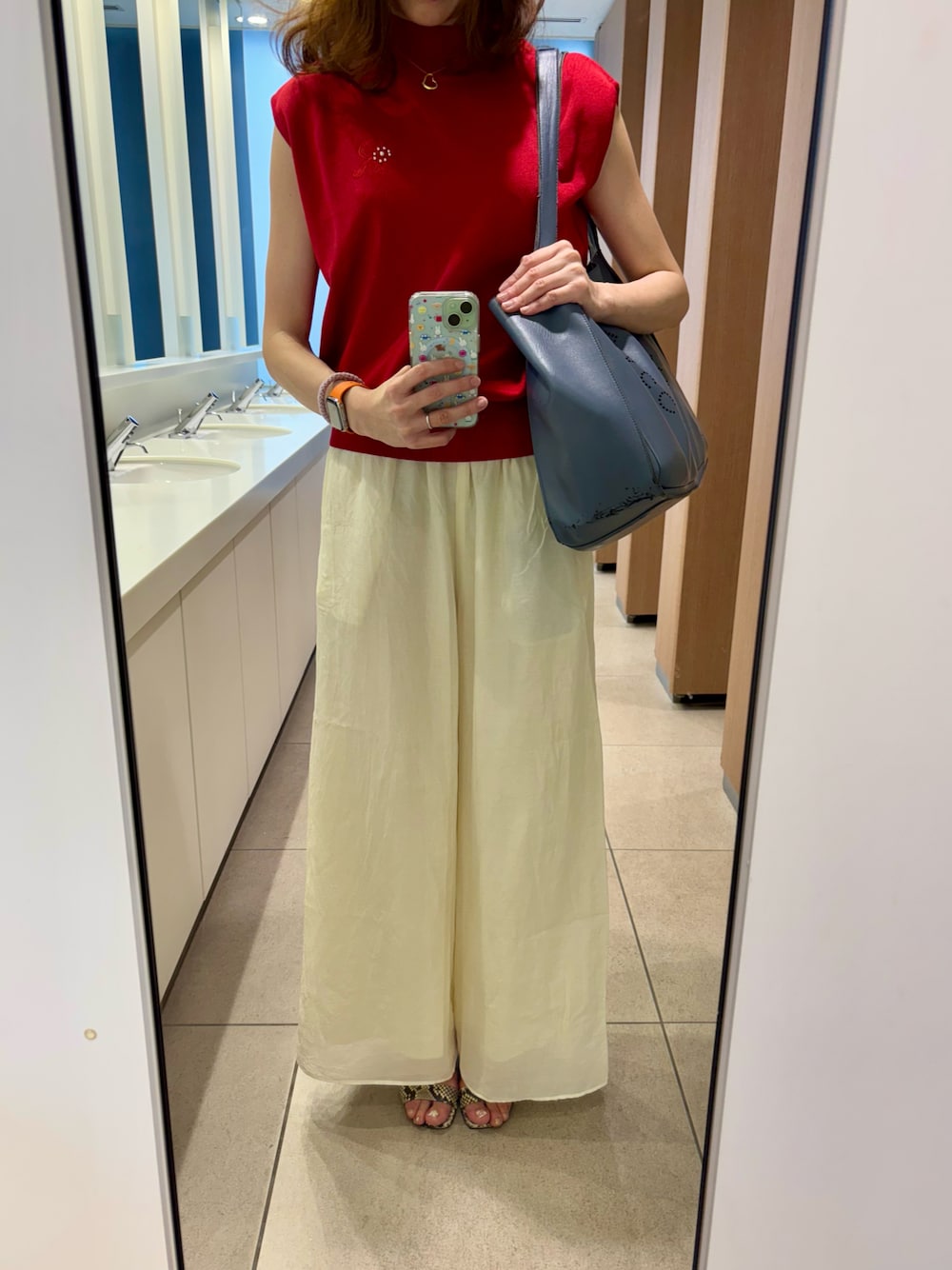 Reneの赤ニットに、DES PRESのワイドパンツを合わせました😌💓 ずっと社内だったからサマーニットにしたけど、やっぱり外に出ると猛暑でしんどい🫠🥵