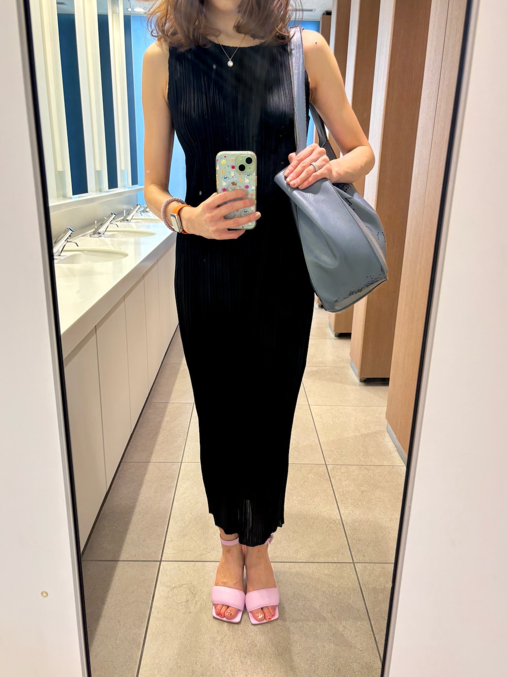 PLEATS PLEASEのワンピースを着ました🐼🖤 ピンクのサンダルを差し色にしてみました☺️💗