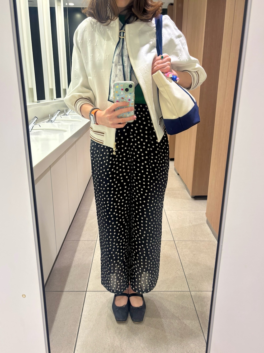 JUSGLITTYのサマーニットに、Rouge Vif Annaのドットパンツを合わせて、Max Maraのジャケットを合わせました🐼🖤 秋の洋服が全然なくて困ってる🫠