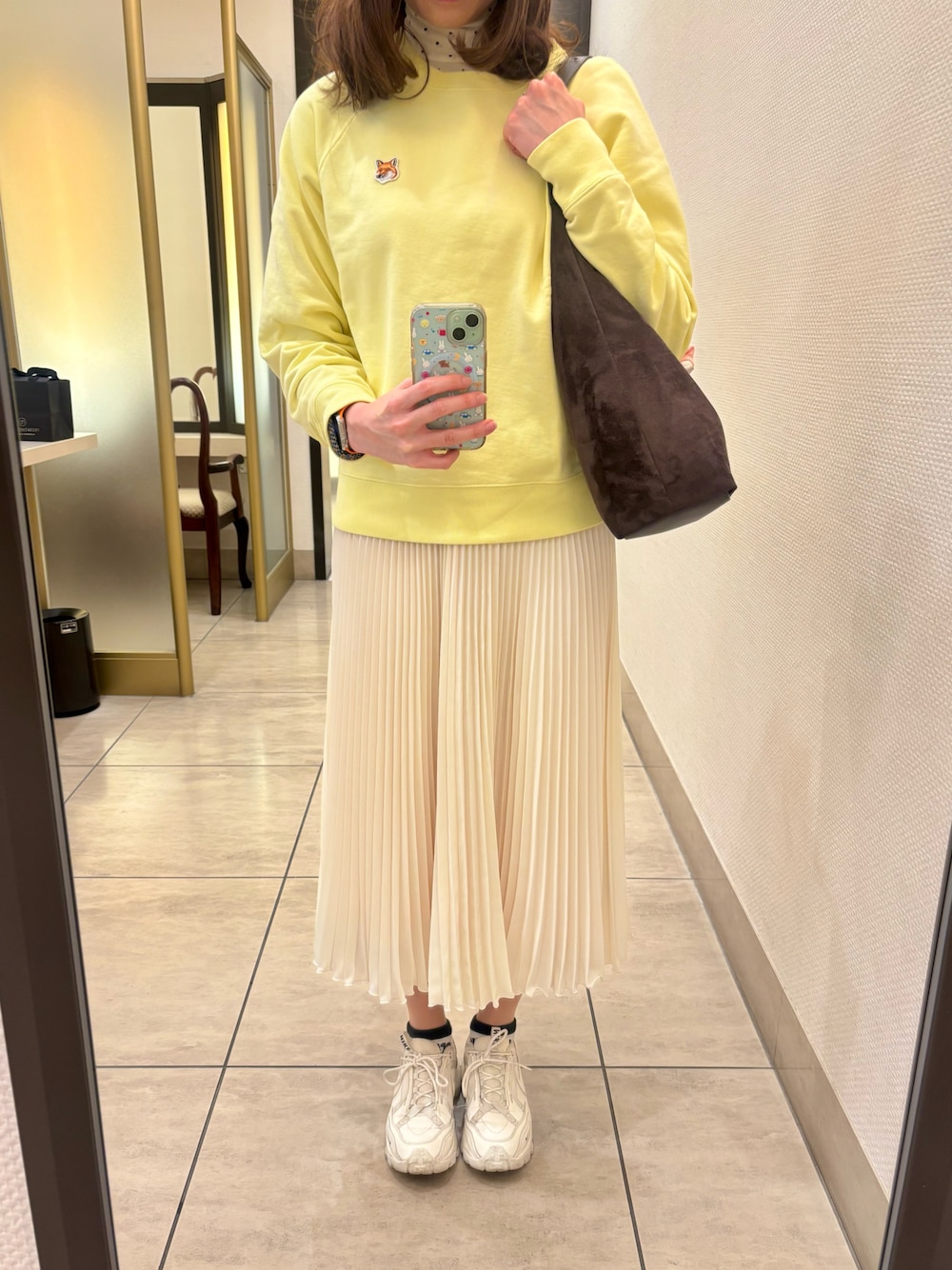 Maison Kitsuneのスウェットに、Reneのプリーツスカートを合わせました🐣💛 CELFORDのタートルネックインナーを合わせて、敢えてアウターなしで🙃🍁