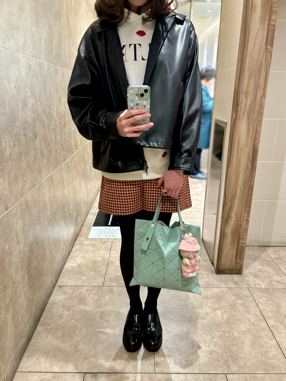 VALENTINOのフーディーに、JILLSTUARTの台形ミニスカートを合わせました🥺💓 ポカポカ陽気だったので、レザージャケットを羽織りました🌸