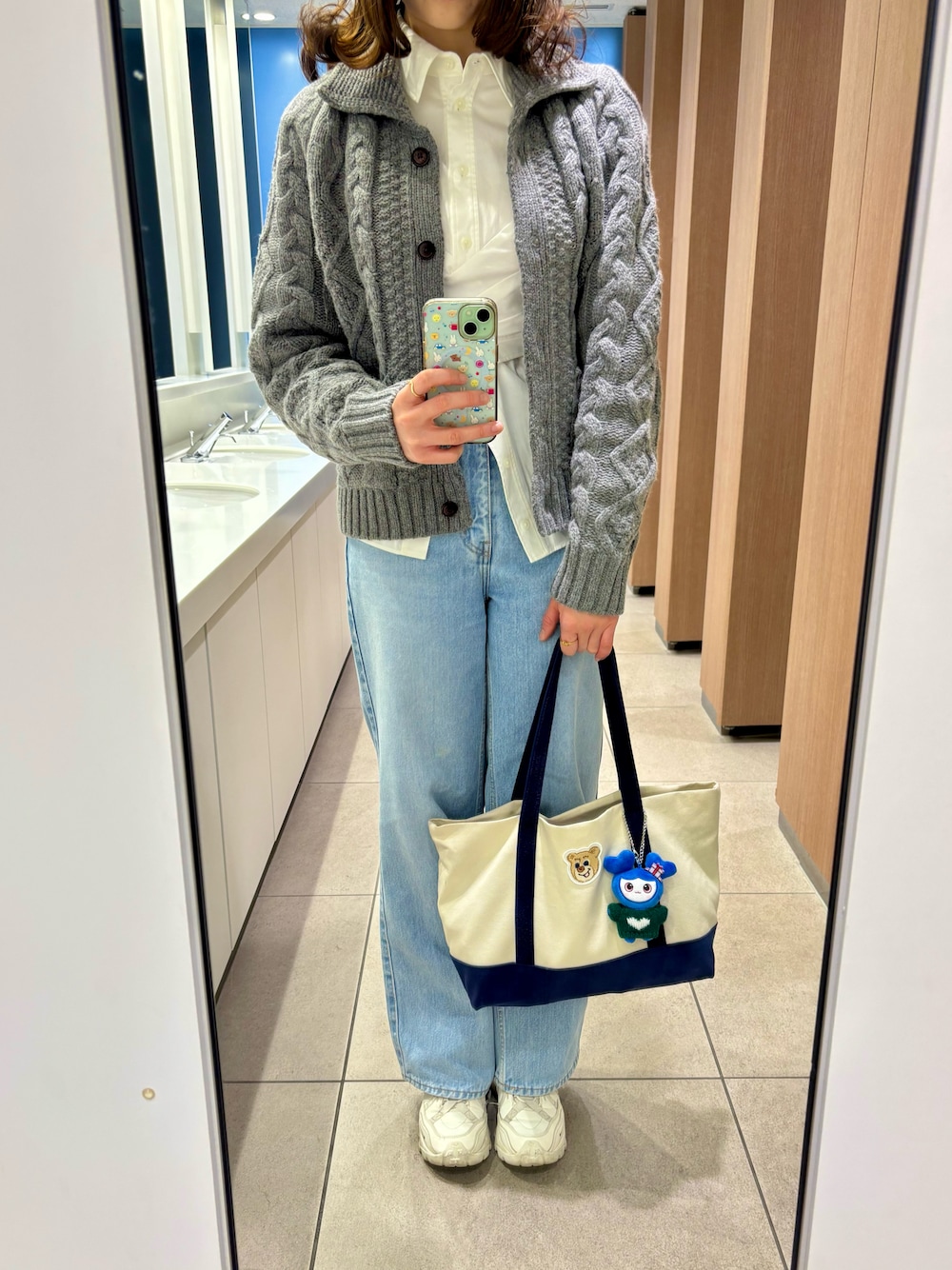 ADEAMの白シャツに、MACPHEEのデニムパンツを合わせました😘💓 SOMEWHEREBUTTERのざっくりニットを羽織りました🧶🩶