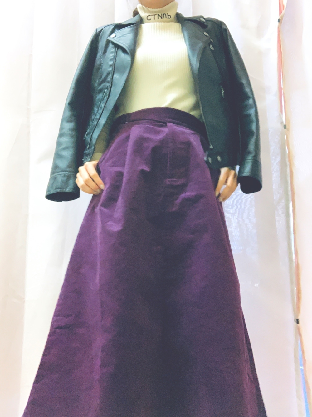 色付きのスカートには、黒や白が1番合わせやすいので無難な白と黒にしました。ハイネックにする事でより女の子らしさをイメージ。