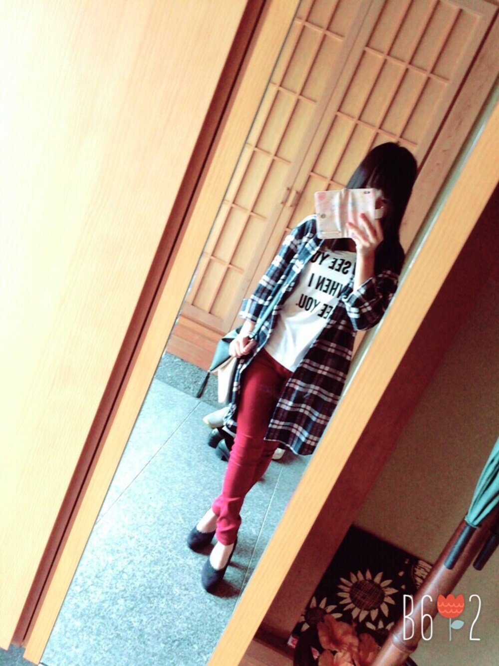チェックのロングカーデと赤スキニーで秋意識