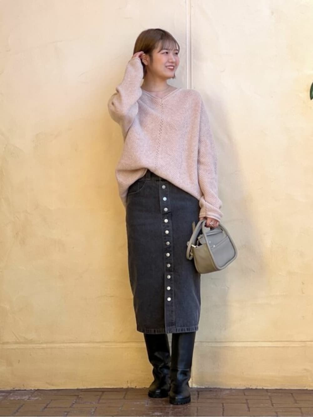 【トップス】 程よいショート丈で小柄な方にもオススメのニットです。 ゆとりのあるシルエットですが、Vネックのデザインですっきりと着て頂けます。 162センチでお尻がちょうど隠れるくらいの着丈でした。 【ボトム】着用サイズ:36 すっきりとしたシルエットで、カジュアルにも綺麗めにも着回せるデニムスカートです。 裾の3つのボタンでスリットを作ることができ、足捌きも良いです。 オールシーズン活躍するアイテムです◎