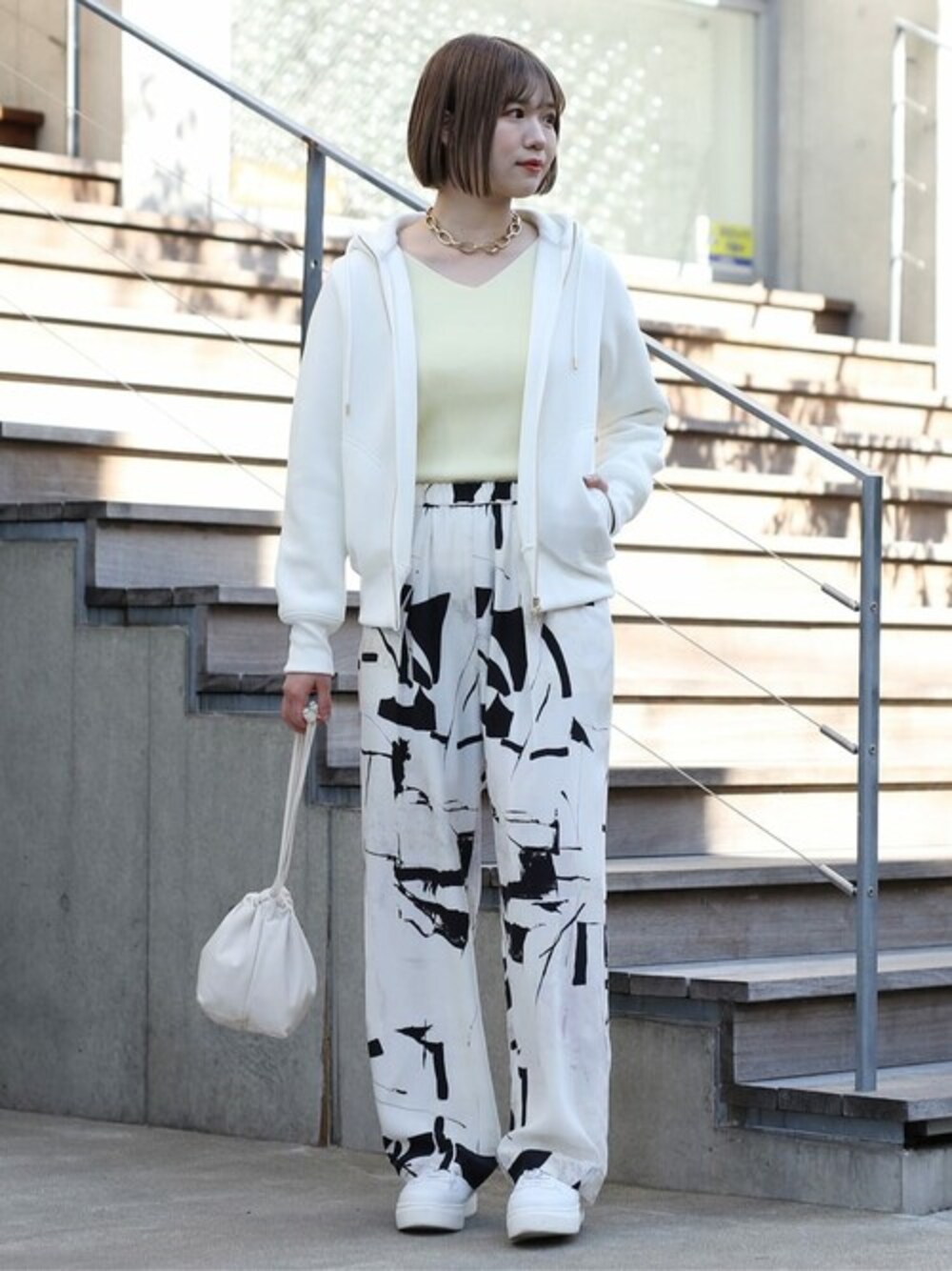 【アウター】 毎年大人気のダンボールZIPパーカー。 すっきりとしたシルエットと上品な生地感で、カジュアル過ぎず、綺麗めにも着こなせます。 軽い着心地で、持ち運びにも便利です◎ 【トップス】 前後2WAYで、着回し力抜群の総針ニット。 コンパクトめなサイズ感ですが、程よく肉感のある素材で、身体のラインを拾いすぎません。 春らしいレモンイエローのカラーがイチ押しです! 【ボトム】 着るだけでお洒落見えするモダン柄のパンツ。 とろみと落ち感がある素材なので、脚のラインを拾わずに楽に着用できます。 裏地が付いているので、透けも気になりません◎