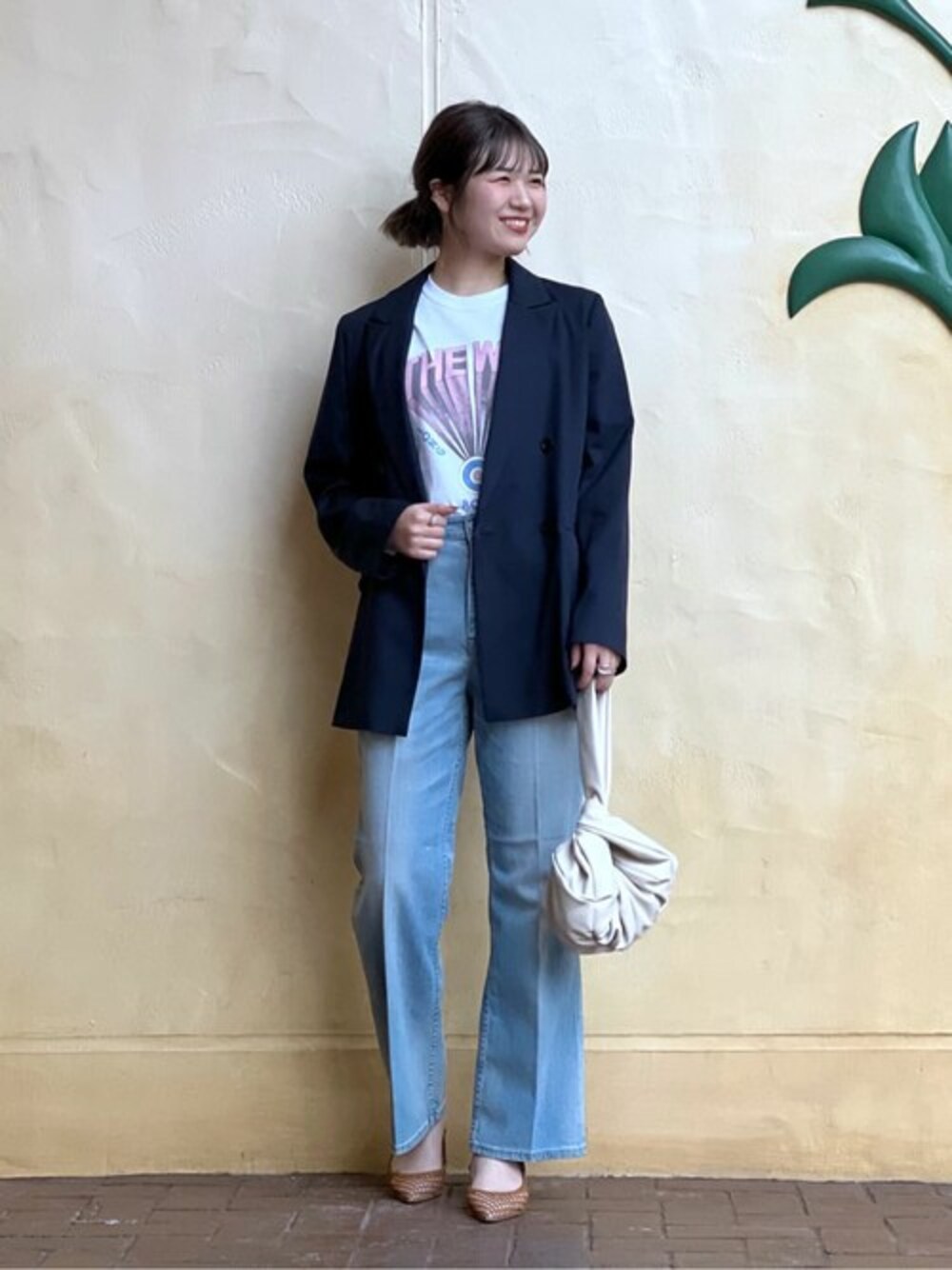 ジャケットを軽く羽織って大人カジュアルなコーデ。 ジャケットはちょうどヒップが隠れる丈感なので、お尻をカバーしてくれます。 オーバー過ぎず、コンパクト過ぎずなのでスッキリ見えるサイズ感です。