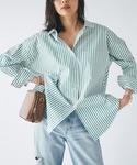 グリーンで合わせた春コーデです。 グリーンのストライプが春らしいシャツです。 程よくオーバーシルエットで、ヒップが隠れる安心の着丈です◎ スカートで綺麗めに着るのはもちろん、デニムでカジュアルに着るのもオススメです。