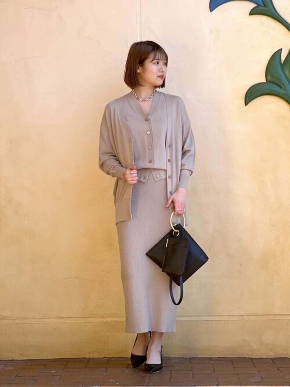 女性らしいニットアップコーデ。 さらっとした肌触りの良いニットです。 綺麗めにもカジュアルにも着回せます。 ベージュトーンのコーデは小物を黒で締めるのがオススメです!