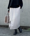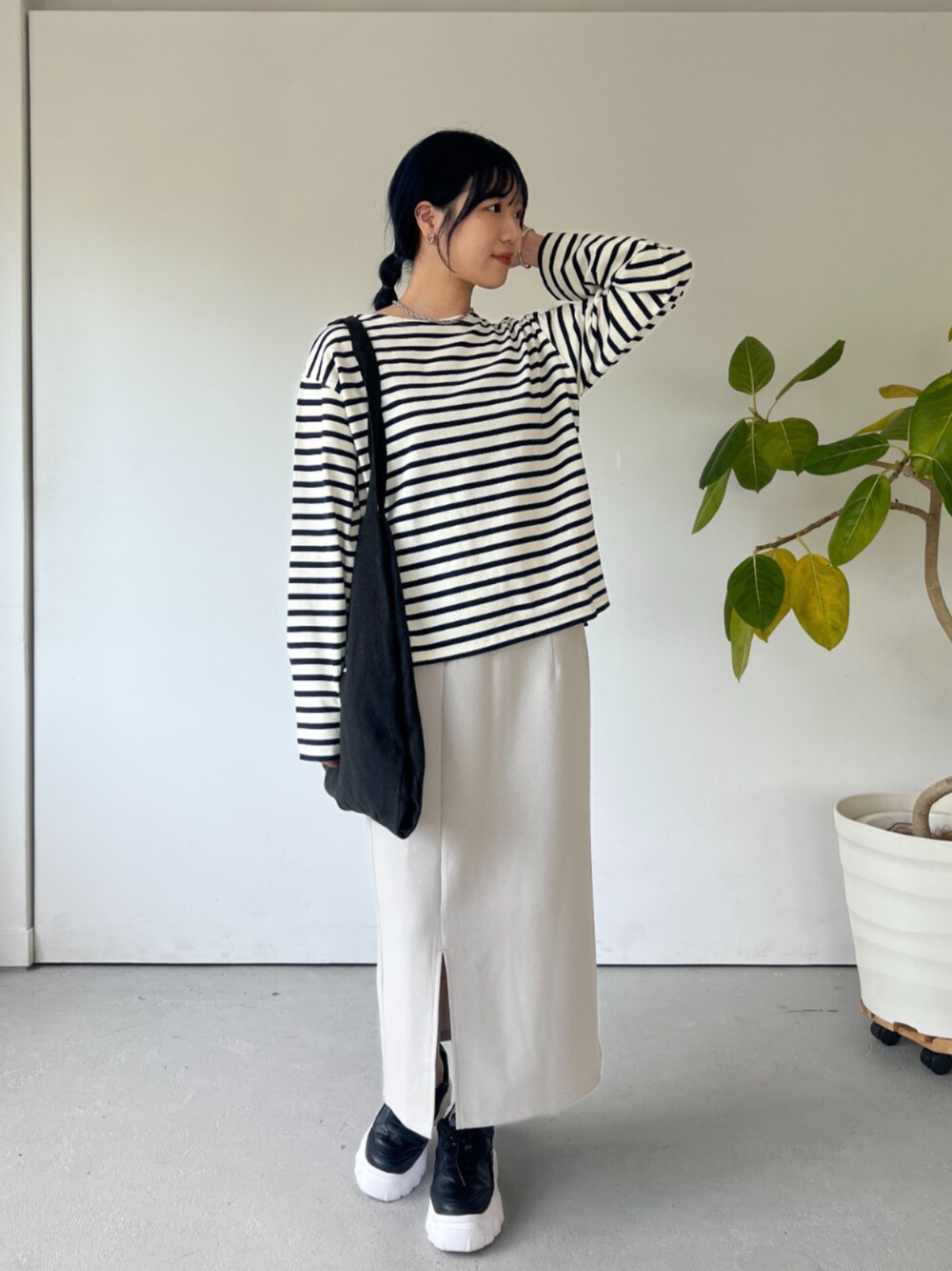 ボーダー×スカートのモノトーンコーデ。 ゆるっとしたシルエットのボーダーカットソー。 長すぎない着丈なので、ウエストインしなくてもバランスが取りやすいです◎