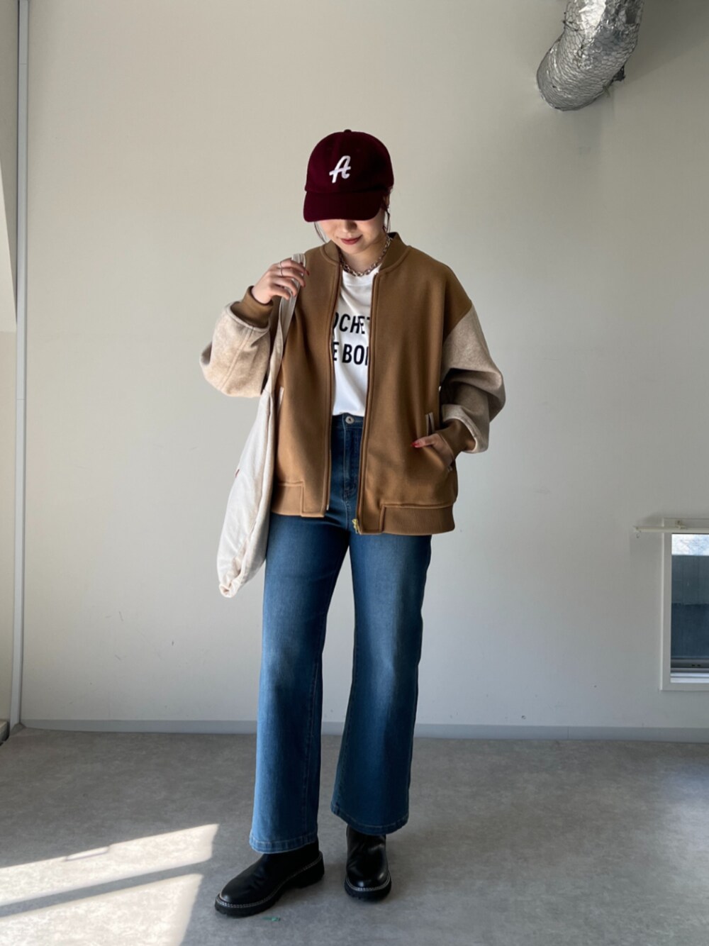 オーバーサイズのブルゾン。 肉厚ですが軽量なのが嬉しいアウターです◎ デニムにキャップでカジュアルに仕上げました。