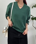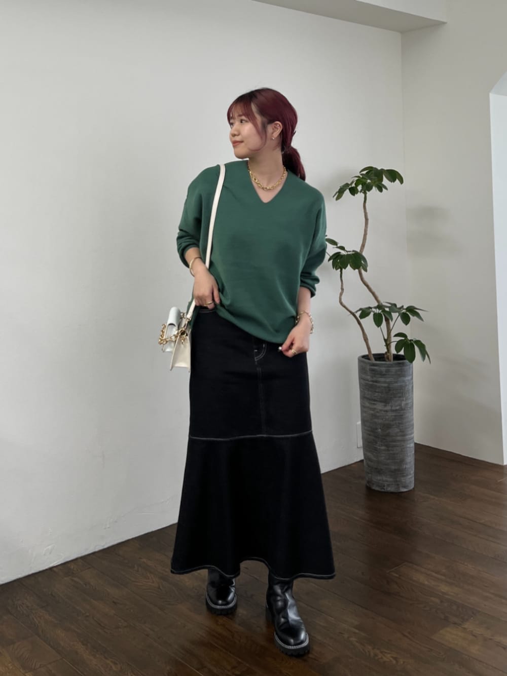 ニット×デニムスカート 名前の通り、柔らかくてのもちもちのニットです。 Vネックなので顔周りをすっきりと見せてくれます◎