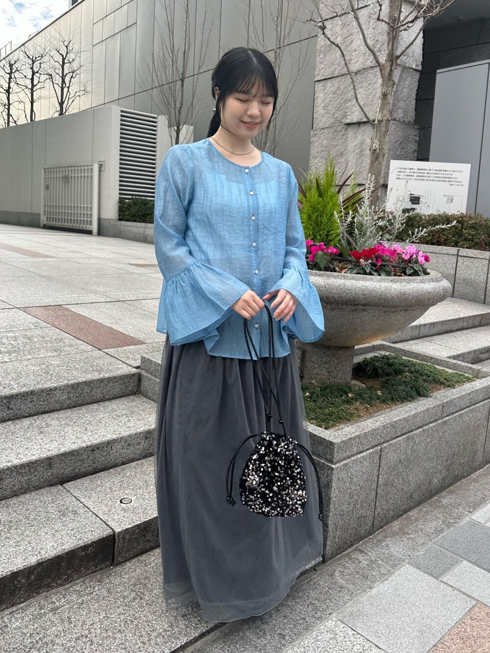 ブルー×グレーコーデ フレアスリーブがポイントのブラウス。 前後2WAYで着用可能です◎
