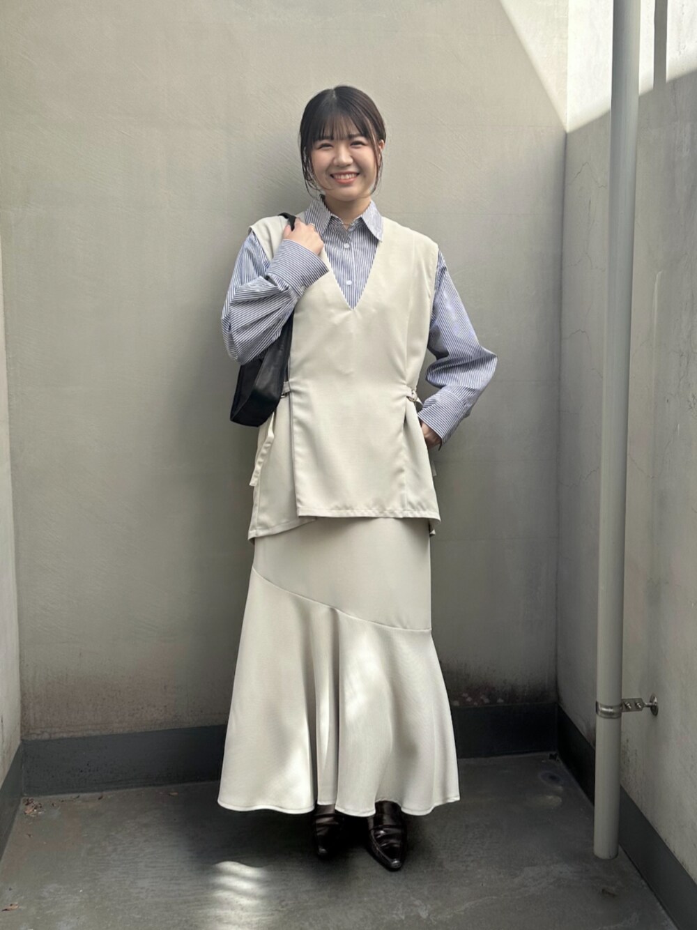 ベストとスカートのセットアップコーデ。 ストライプシャツ合わせでカジュアルに◎