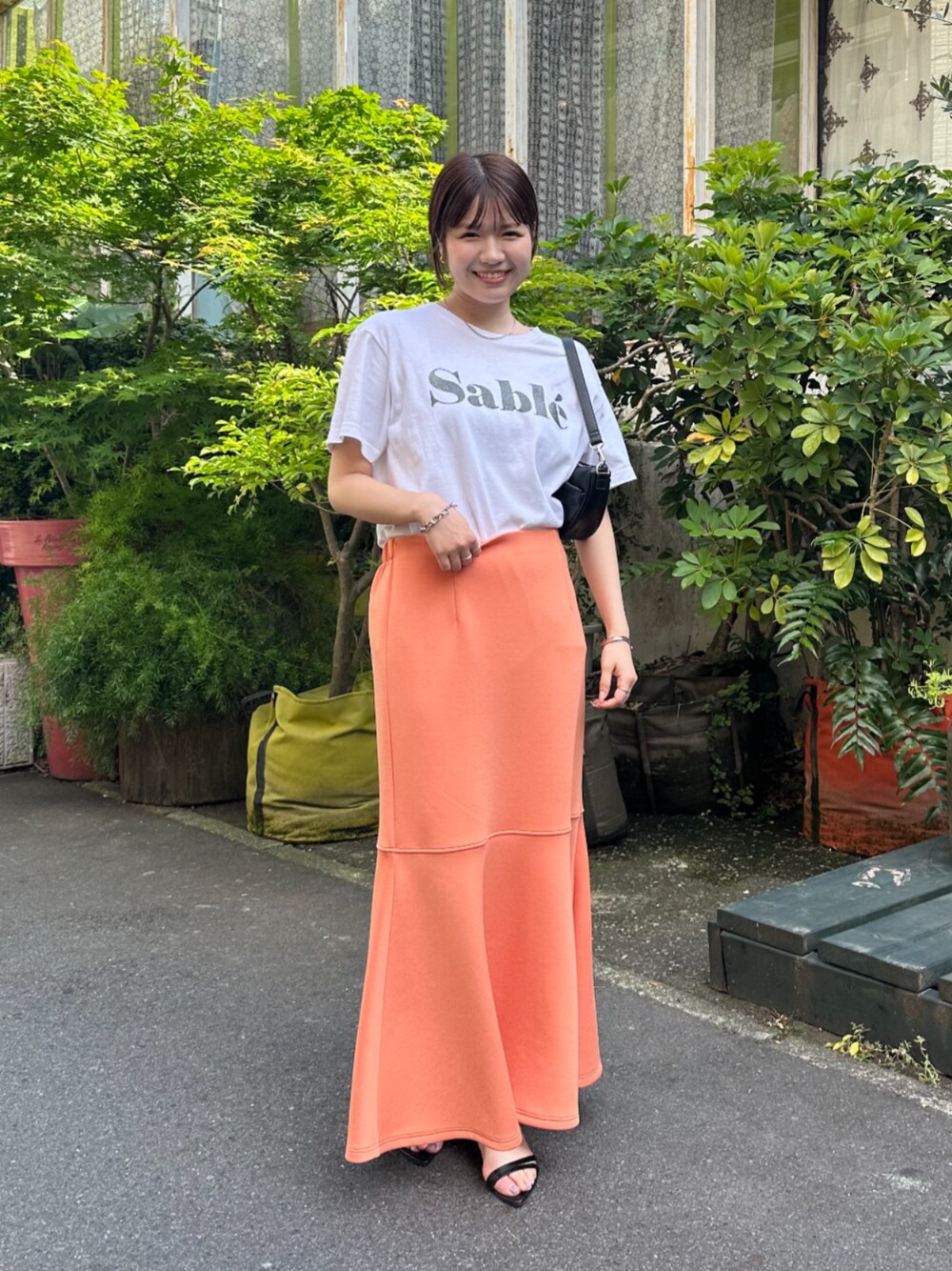 【トップス】 大人カジュアルなロゴT。 ゆったりシルエットで着やすいです◎ 【ボトム】 柔らかい肌触りのマーメイドスカート。 162cmでLサイズ着用です。