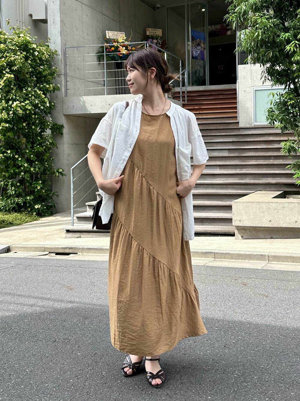 【ワンピース】 ギャザーが斜めに入ったデザインワンピ。 リネン混で夏にぴったりです! 【トップス】 ノースリーブワンピースの羽織りにちょうどよいシャツ。 さらっとした素材感なので日除けや冷房対策におすすめです