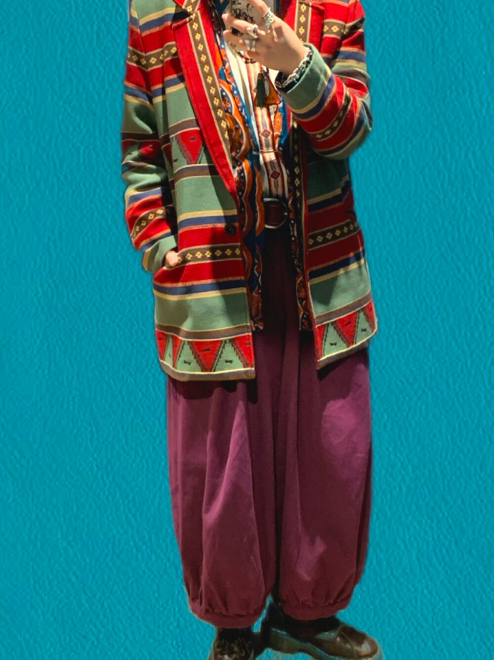 お久しぶりです☆彡. 2023年になりましたね。 久しぶりに投稿します。 寒い日が続き首元を締めたかったので柄×2キレイめコーデ! ネイティブ柄のジャケットと中のペイズリー柄のカーディガンの色味も柄も相性良い、、 チャイハネさんで購入したこのバルーンパンツ。優勝すぎて自分の持ってるアイテムとの相性も良くて沢山愛用してます🏆