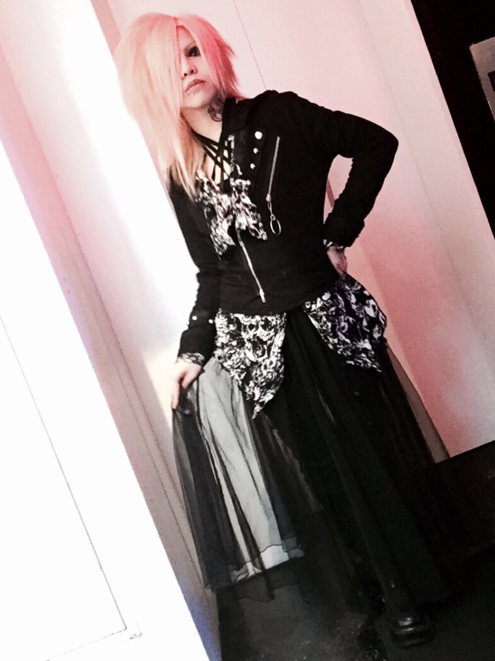 今日はゴシック調に。カットジャケットと花柄シャツを合わせて柄を抑えめに。ボトムにはパンツの上からシフォンスカートを。