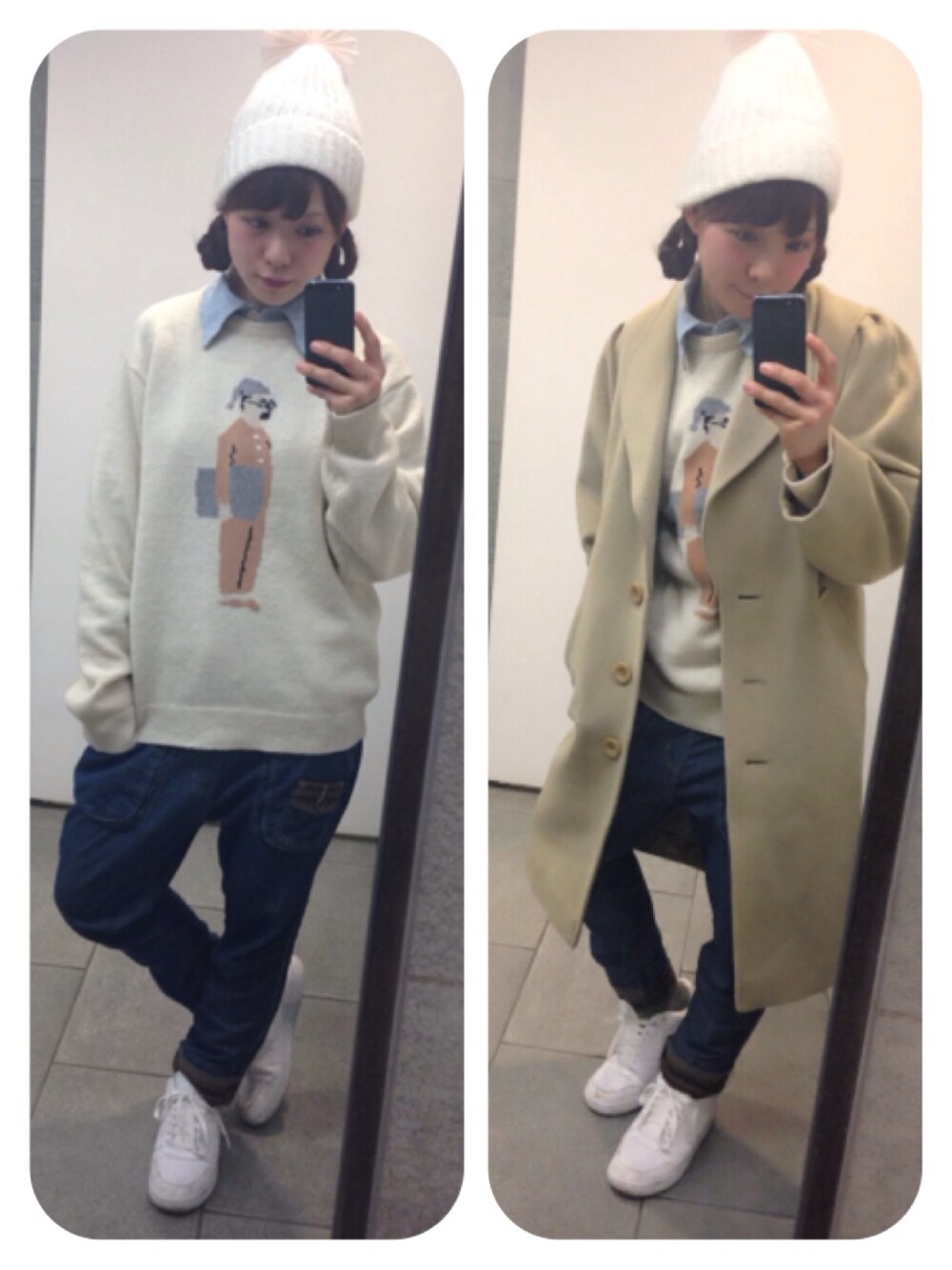 コートは古着です! iamiで今年の初売りで購入した おじさんニットです ずーーっとまえから狙っていたので この機会に買えてほんっとにうれしくて 毎日着たいです! ボトムスはすこしサルエルぎみの形が とってもお気に入りです! 最近白っぽくまとめるのがすきです