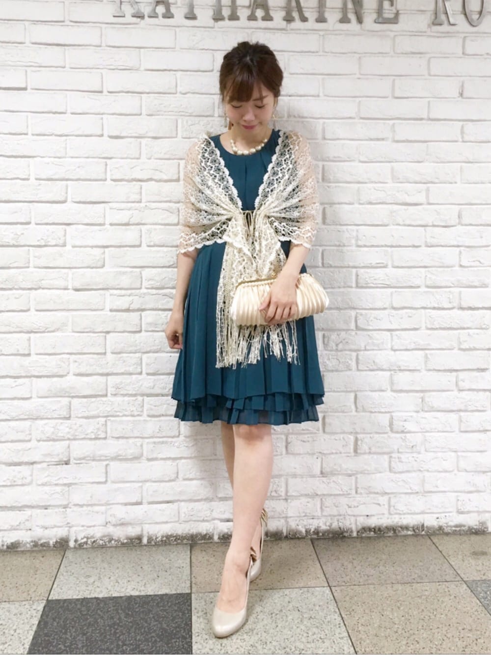 ボックスプリーツが珍しいワンピースです。 ラメ糸の入ったレースショールで お顔映りも華やかなパーティースタイルに❤️ 深みのあるグリーンがきれいです。