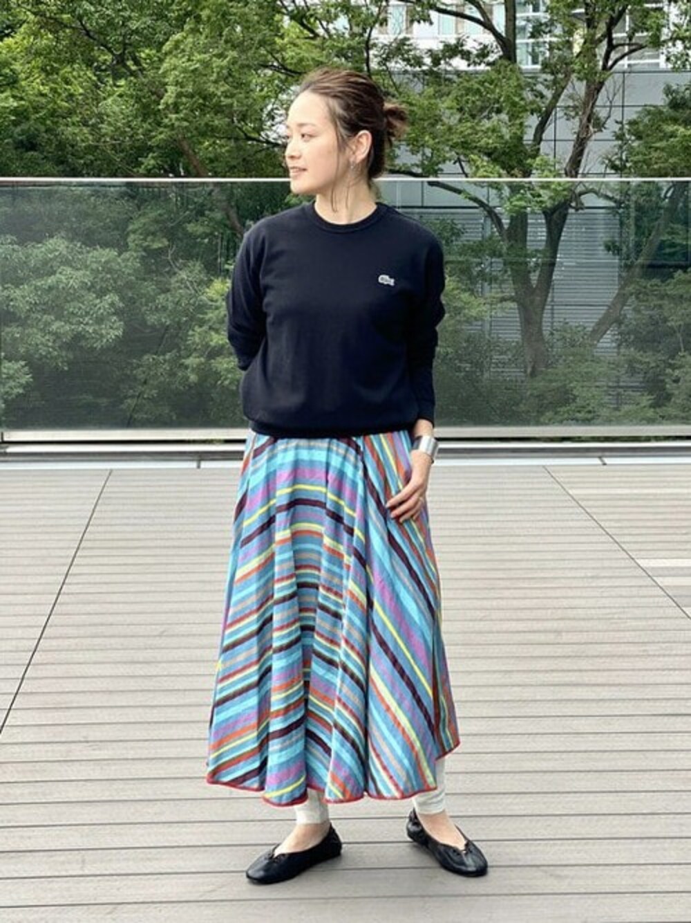 手書きのようなプリントが可愛いサーキュラースカート。ラコステのロンTは、綺麗見えするのでおすすめです。