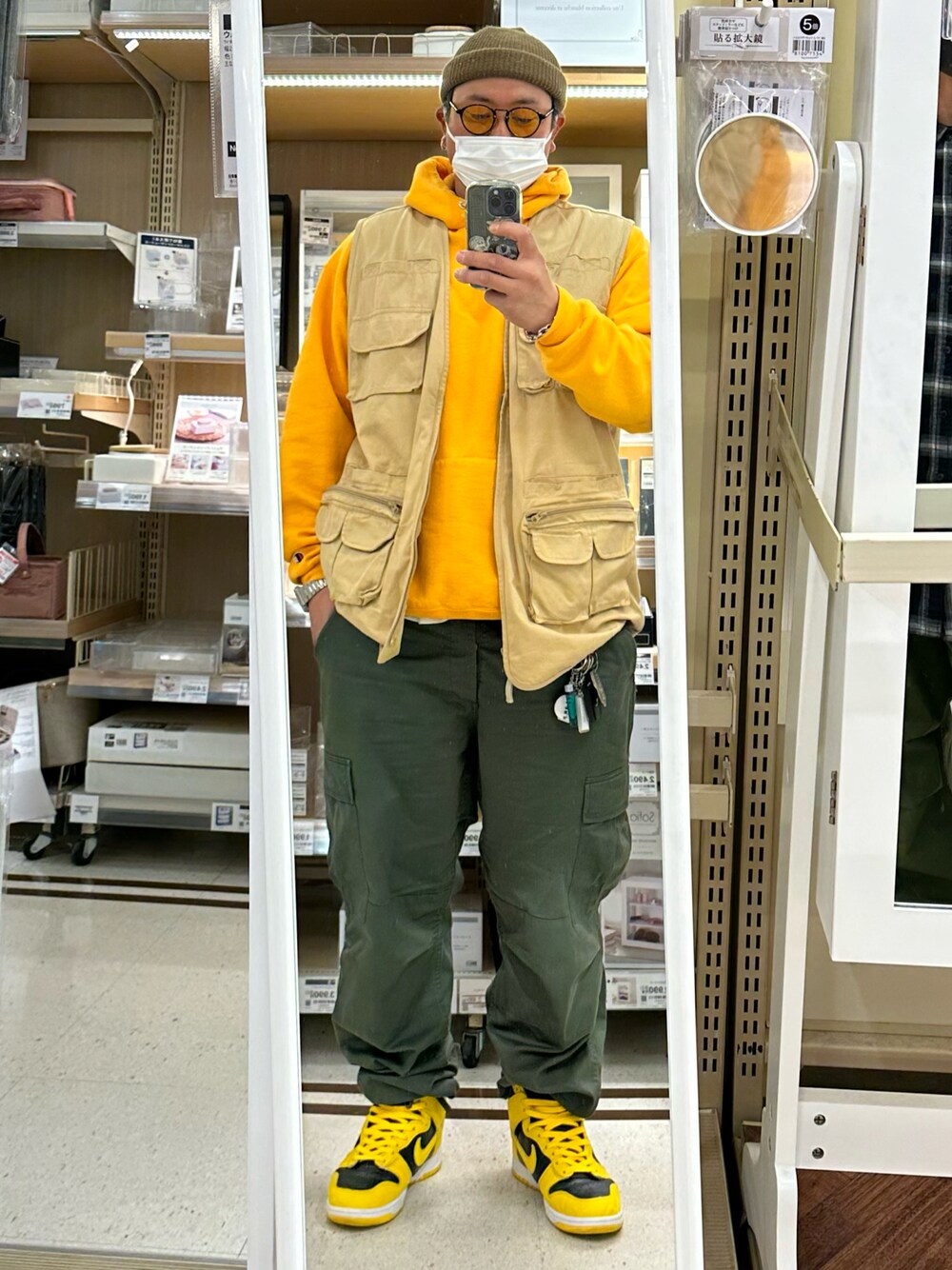 投稿し忘れてたので 今更UP 古着屋さんで購入したベスト着用 黄色をメインに🟡 ROTHCOのカーゴパンツに ちょっと色外ししたカーキの ニットキャップで色合わせしました✌🏻