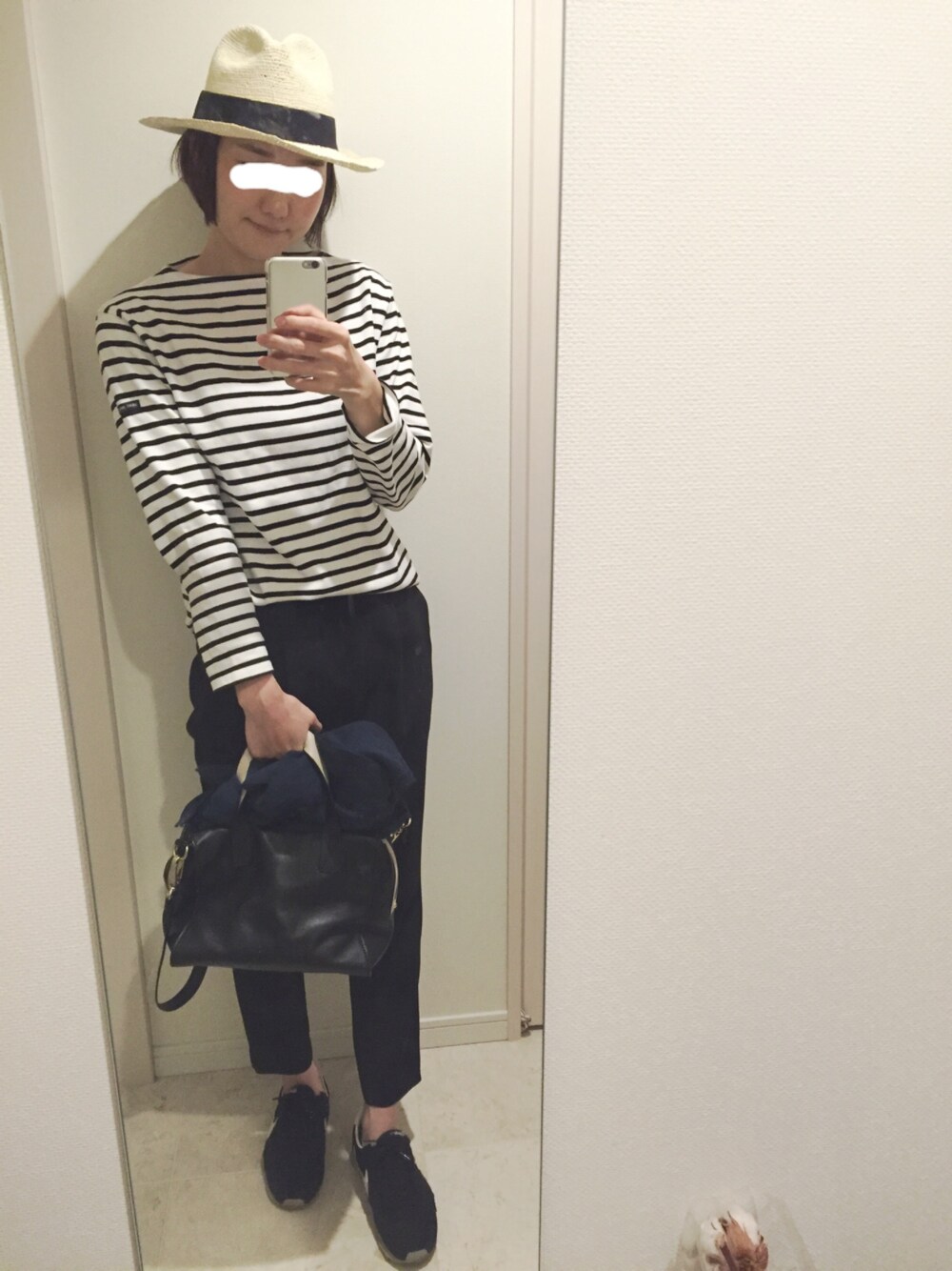 ボーダー×黒のシンプルコーデ。 黒のジョッパーズパンツはエンフォルドで購入✨いつもの黒パンツがぶかぶかになってしまったので買い換えました。本当に形が綺麗で長く愛用できそうです☻シンプルコーデにハットをポイントにしてみました。