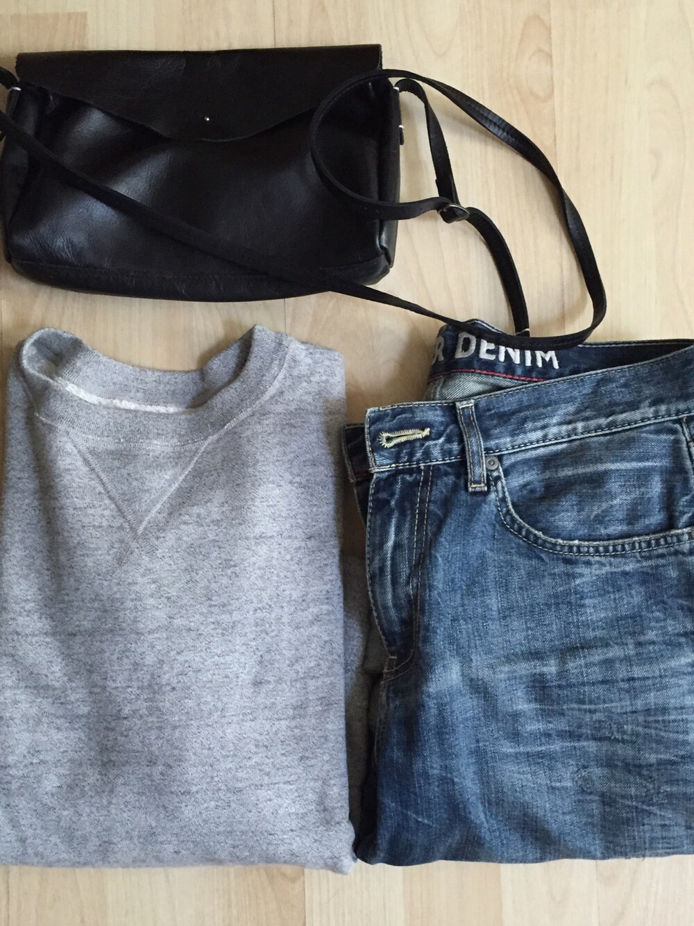 グレー×ブルー×ブラック。 ベルト、スニーカー、鞄をブラックに。とことんボーイズコーデでお散歩へ☻