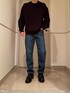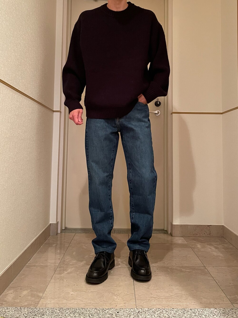 黒のセーターです。 GUのワイドフィット畦セーターで168㎝でSサイズを着用しています。 黒と青の組み合わせが個人的には気に入っています。