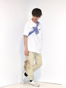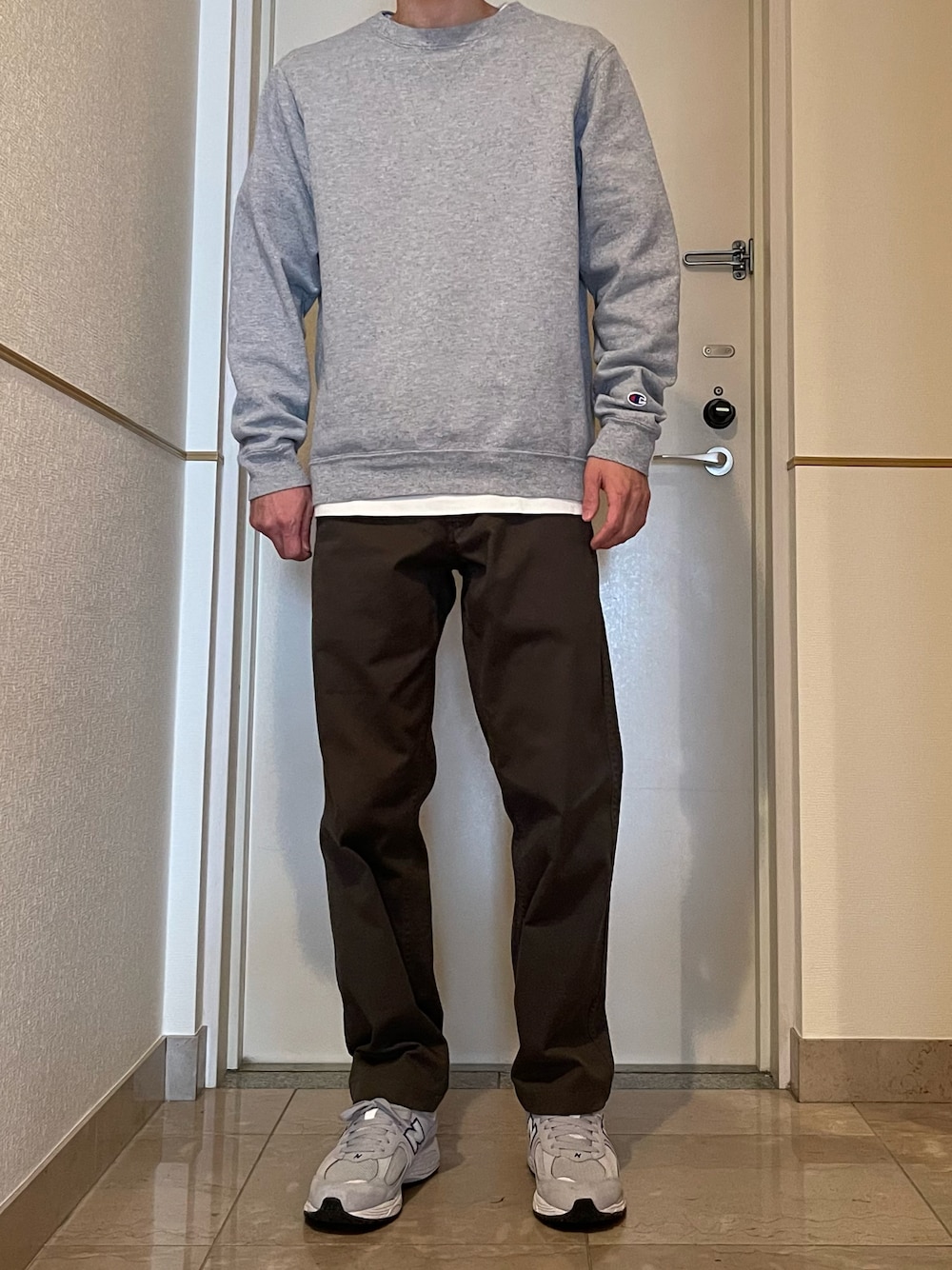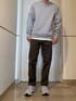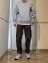 グレーのスウェットにカーキのパンツを合わせたシンプルなコーデです。