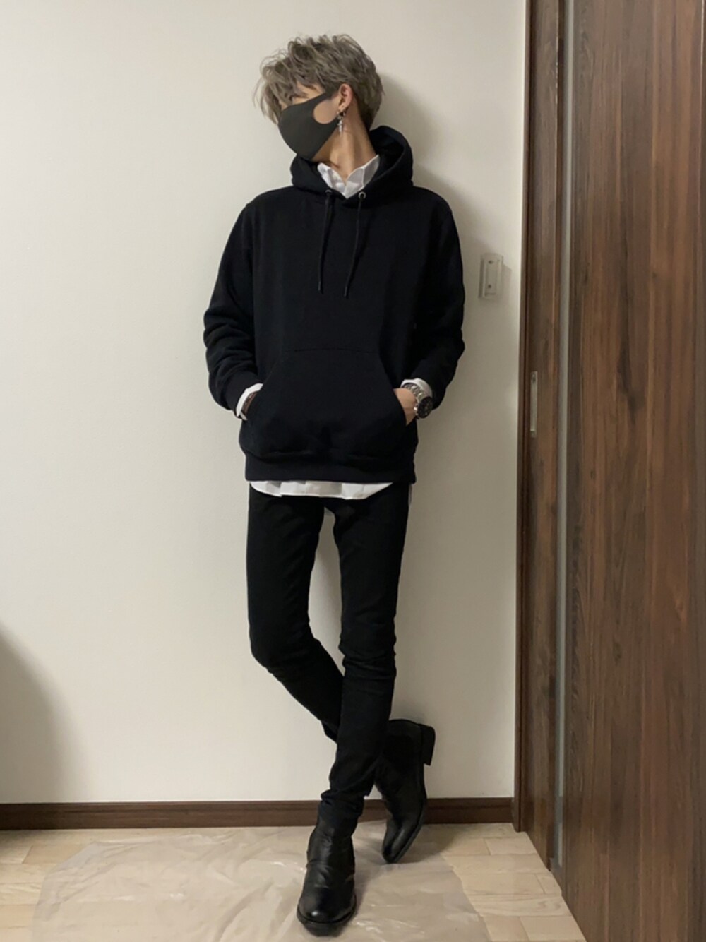 見ていただきありがとうございます! 白シャツ黒パーカーと黒スキニーコーデです!