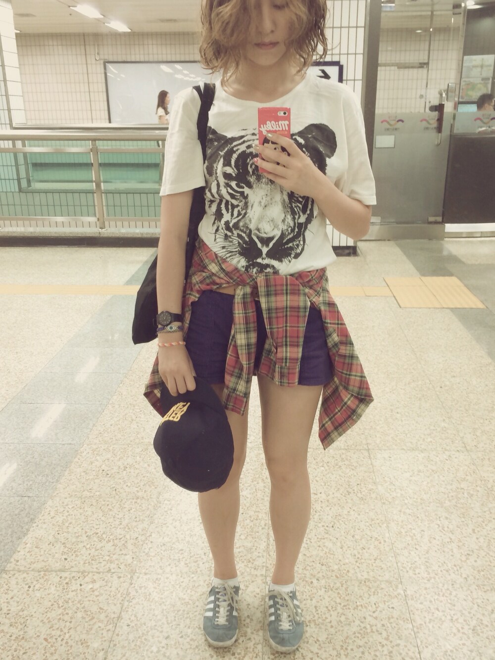 グリーン系のスニーカーを着用したレディースの夏コーディネートの1枚目の写真