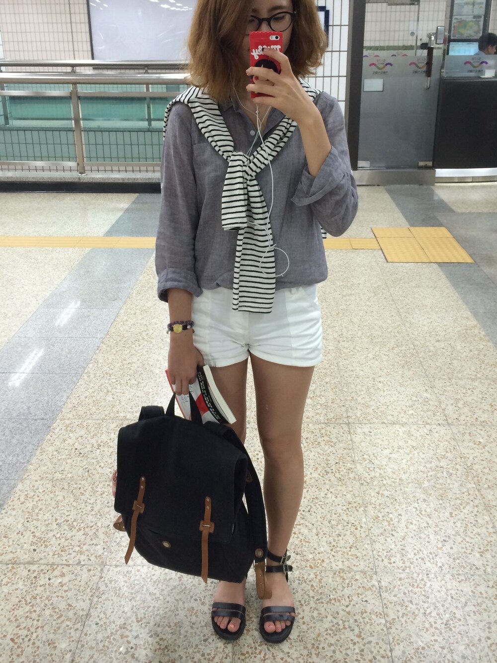 ブラック系のバックパック/リュック、ホワイト系のその他パンツを着用したレディースの夏コーディネートの1枚目の写真
