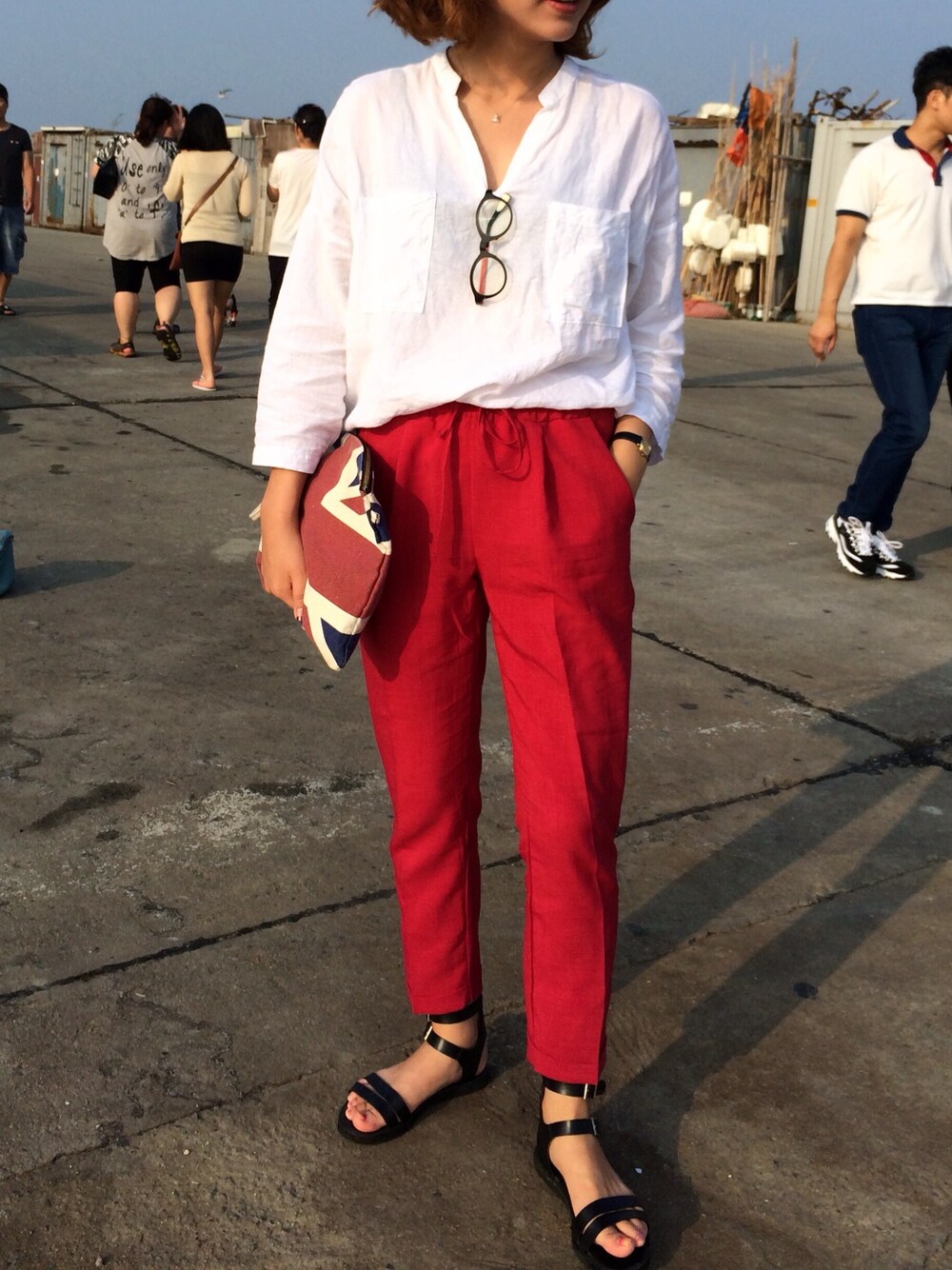 Deep red slacks pants White shirts Union jack clutch bag
