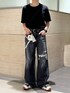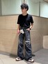 ユニクロの黒Tをジャスト目サイズで着て、ワイドストレートデニムにタックイン 厚底スニーカーに裾溜めつつ履く パンツが良ければTシャツプチプラでも様になる
